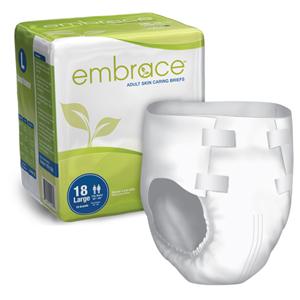 Green, Latex Free Allergen Protection, Disposable Embrace Adult Skin Caring Briefs or Diapers with Ultimate Absorbency and Leakage Barrier are the ultimate, breathable, cloth-like brief. This brief or diaper offers premium features such as inner leg gathers and an enhanced acquisition zone for dryness, comfort and odor control. Compliance ® Better-Fit Comfort Tab System features extra-wide diaper style closure tabs to securely grip and hold the outer fabric. The flexible diaper style closure tabs can fasten and refasten anywhere on the durable side panels for easy application and a customized fit. Compliance ® Skin Caring Dry-Dignity Fabric is breathable and helps prevent skin irritation by increasing air circulation and reducing heat buildup. Dry-Dignity Acquisition Zone prevents leakage by channeling the void more evenly throughout the pad for higher absorbency while preventing gel block when a rewet occurs . Inner and outer leg gathers provide added comfort and fecal containment . Ultimate-absorbency polymers improve skin dryness and control odors . Soft, quiet cloth-like fabric is similar to traditional underwear, providing comfort and dignity.